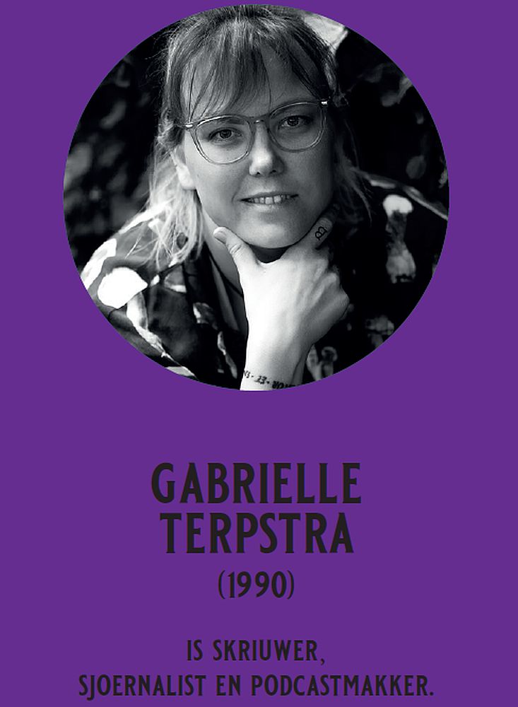 Gabriëlle Terpstra liket him as nijkommer yn de Fryske literêre wrâld as in fisk yn it wetter te bewegen. Nei har debútbondel wurke se fuort al oan in nije dichtbondel. Dat wurk lei se wat fansiden, om’t se tagelyk dwaande wie mei ferhalen en in novelle, dy’t úteinlik op in roman útrûn is. Dêrneist is se boekferkeaper, skriuwt foar it kulturele tydskrift de Moanne, sit yn de redaksje fan it literêre tydskrift Ensafh, is mei-oprjochter fan it dichterskollektyf Pauper Poëzie en se makket mei Arjan Hut podcasts oer it kulturele libben yn Fryslân.